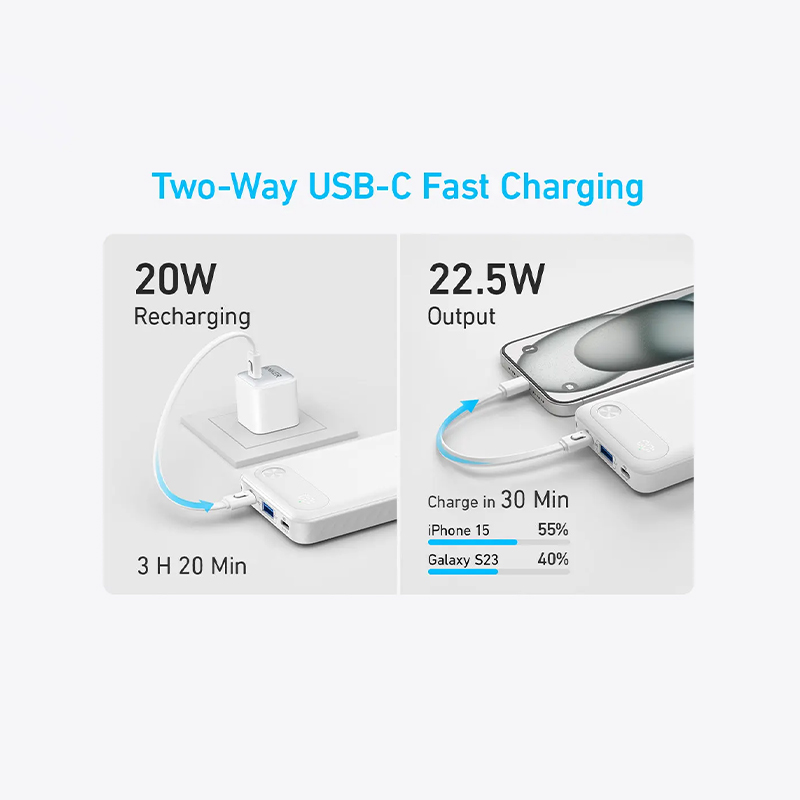 پاوربانک Anker A1257 از توان خروجی حداکثر 22.5 وات پشتیبانی میکند که امکان شارژ سریع انواع گوشیهای هوشمند، تبلتها و گجتهای دیجیتال را فراهم میسازد. این مدل با پشتیبانی از فناوریهای شارژ سریع، دستگاههای سازگار را در مدتزمان کوتاهتری نسبت به پاوربانکهای معمولی شارژ میکند؛ ویژگیای که برای کاربران پرمشغله اهمیت بالایی دارد.